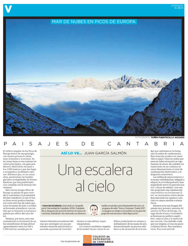 En esta sección «1 paisaje 1 geógrafo», la D.T. del Colegio de Geógrafos de Cantabria ha patrocinado publicaciones del Diario Montanés. Cada semana de 2019, los artículos firmados por sus colegiados analizaban la diversidad y riqueza de los paisajes que conforman el territorio de la Comunidad de Cantabria.
